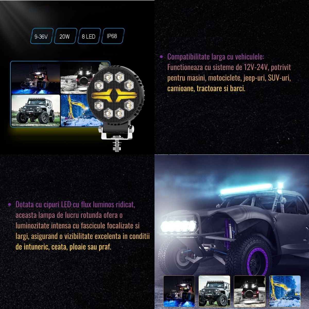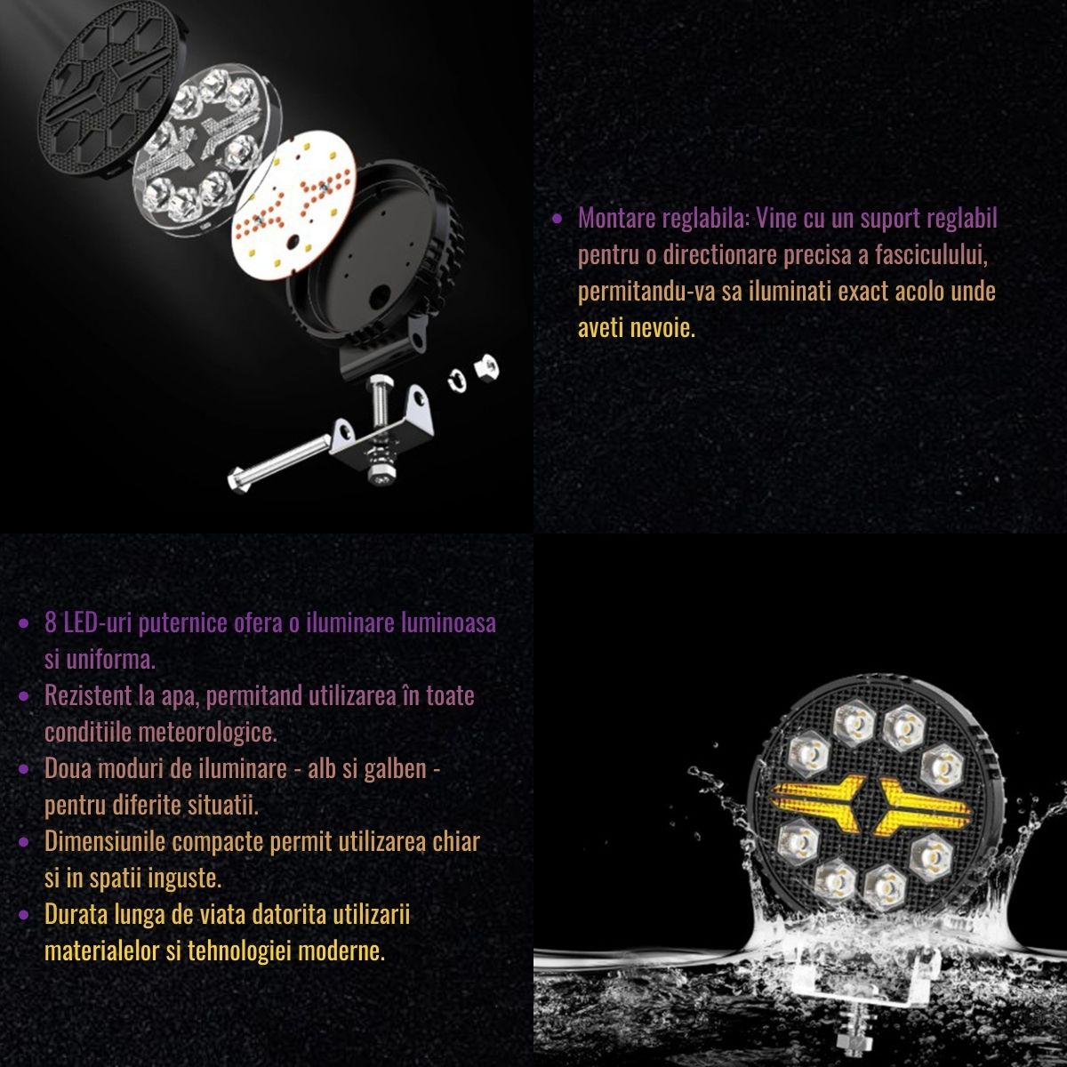 | Tip lumina | 8 LED-uri tip fascicul spot (alb) + DRL (galben) |