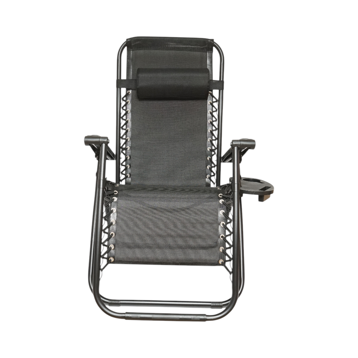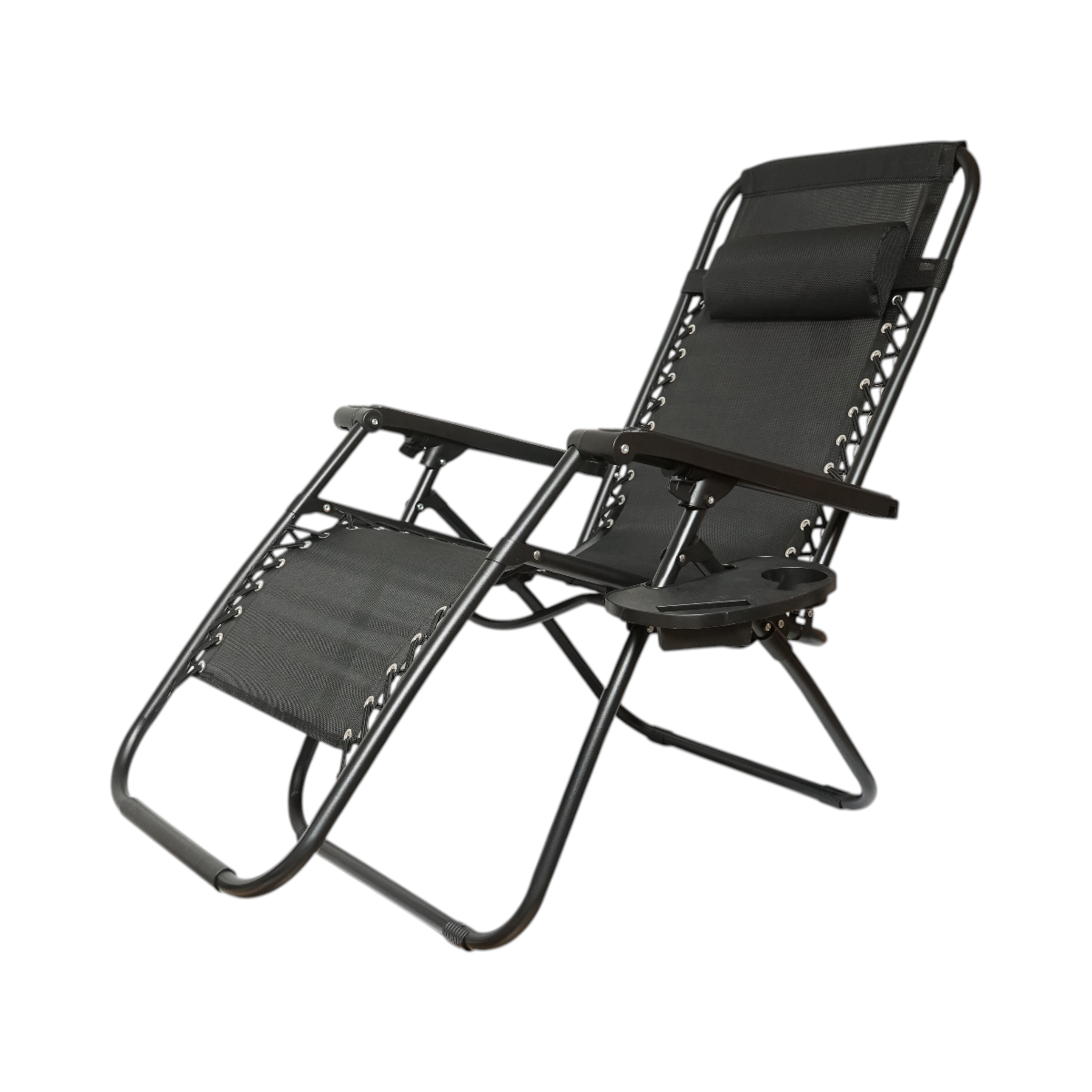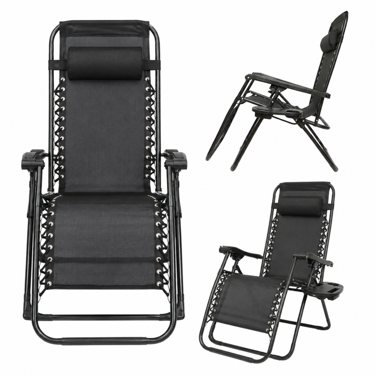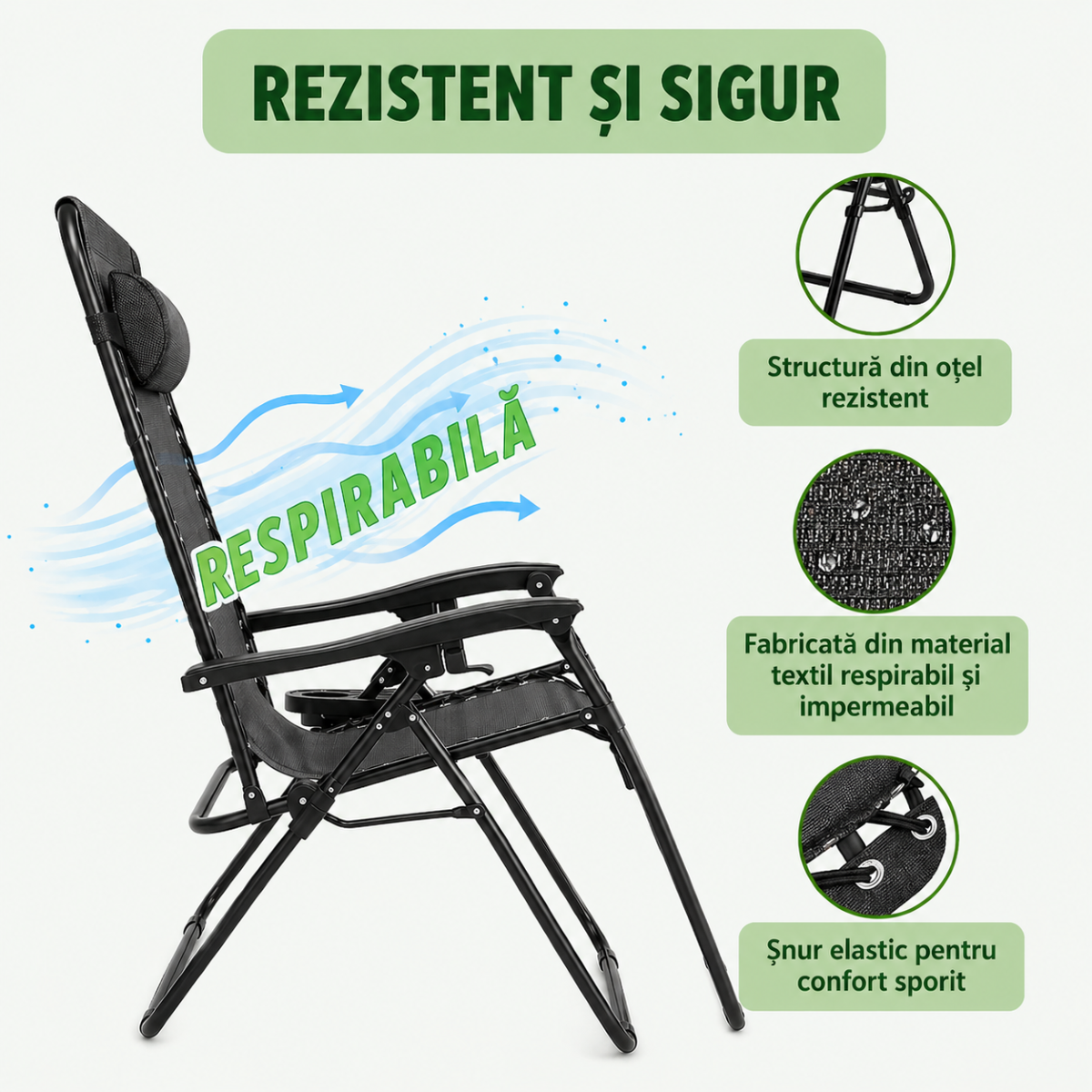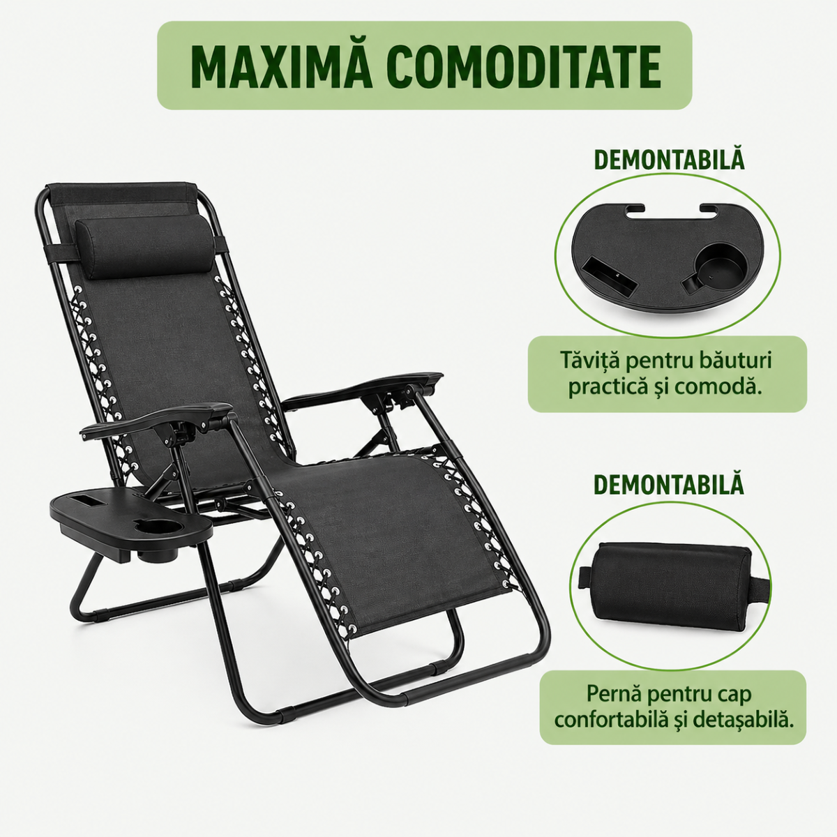 Sistemul de inclinare reglabil pana la aproximativ 160° permite ajustarea pozitiei in functie de preferinte, iar tetiera reglabila si detasabila ofera suport suplimentar pentru zona capului. Scaunul este prevazut cu suport pentru pahar si tava multifunctionala, fiind extrem de practic pentru momentele de relaxare. Structura din otel rezistent si materialul textil respirabil asigura durabilitate si confort pe termen lung.