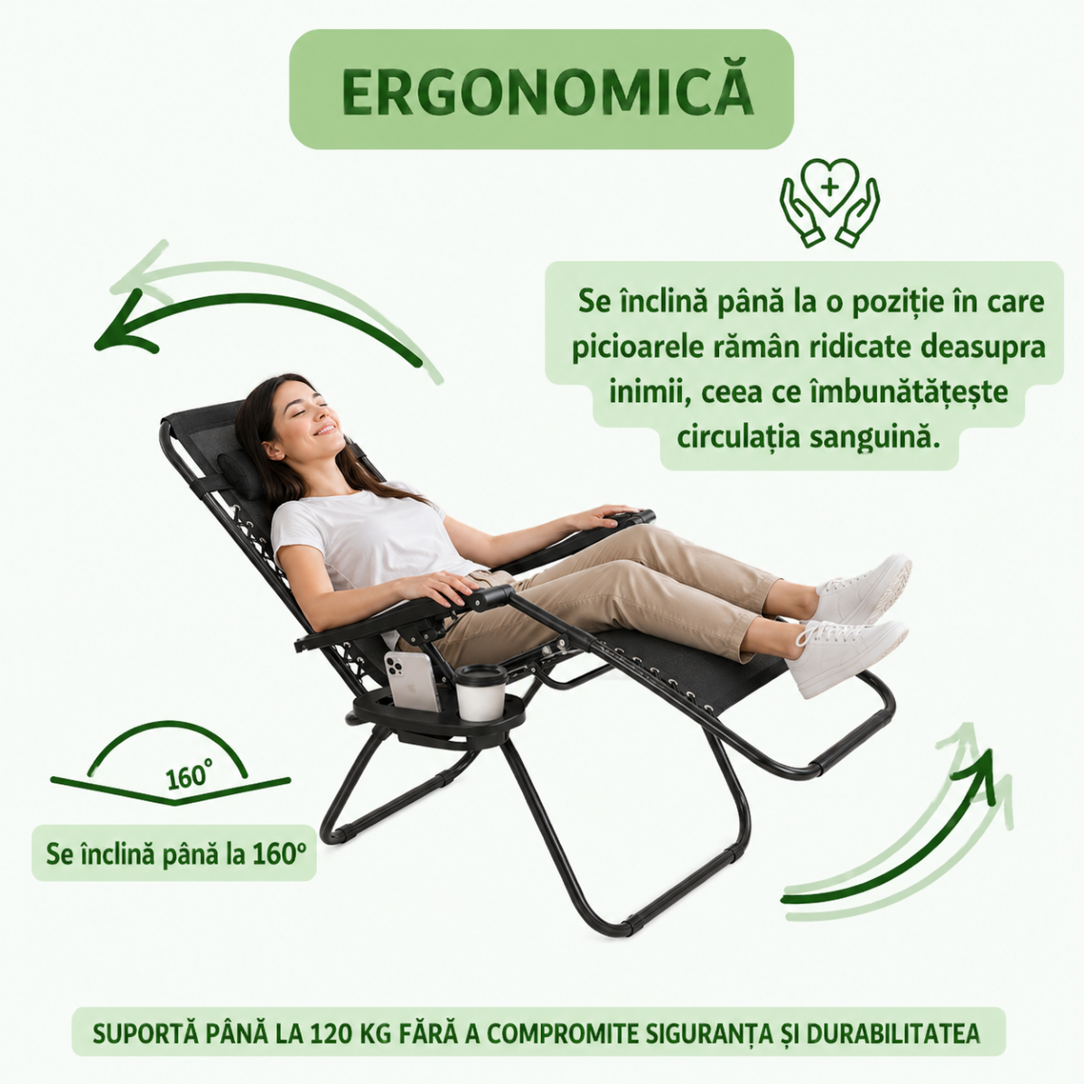 Scaunul de relaxare pliabil zero gravity este conceput pentru confort maxim si relaxare completa, permitand adoptarea unei pozitii ergonomice in care corpul este sustinut uniform. Designul tip sezlong reduce presiunea asupra coloanei si imbunatateste circulatia sangelui, fiind ideal pentru utilizare in gradina, terasa, camping sau vacanta.
