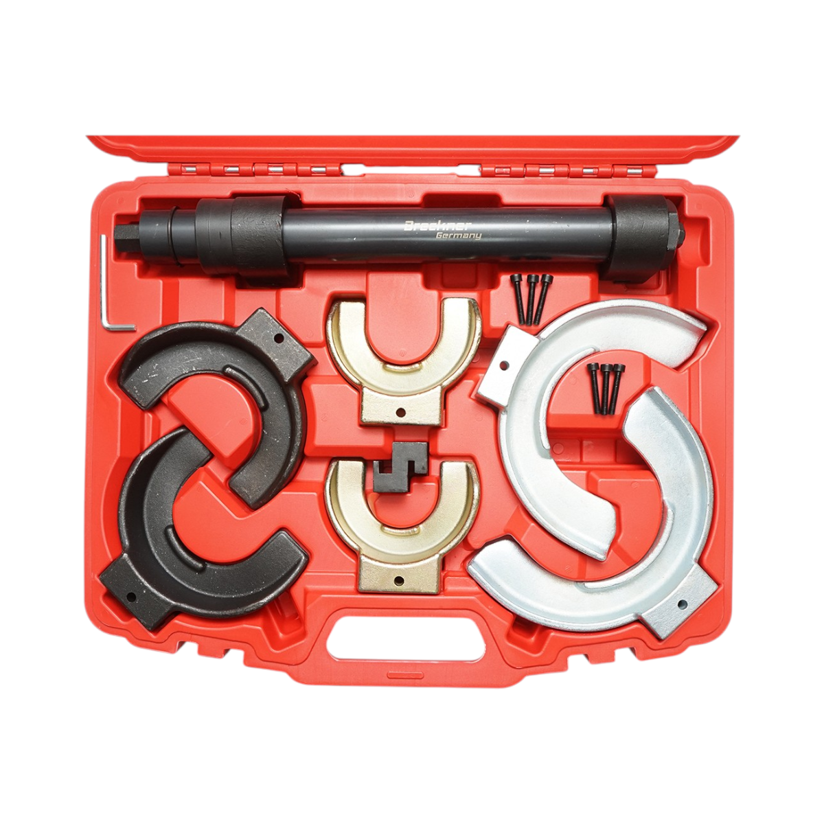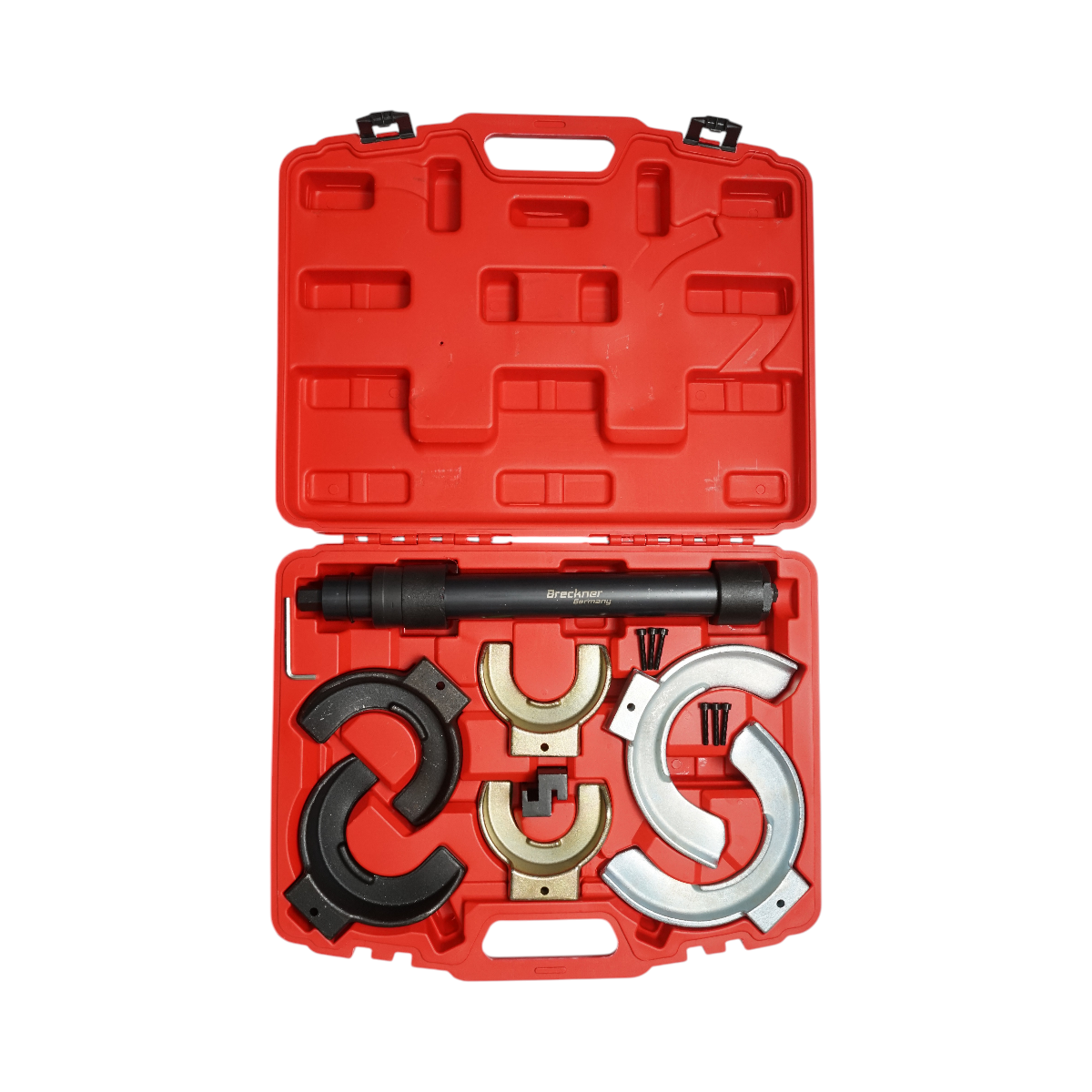 Trusa presa pentru arcuri elicoidale este conceputa pentru comprimarea in siguranta a arcurilor de suspensie auto in timpul operatiunilor de service si inlocuire amortizoare. Sistemul include 3 seturi de gheare interschimbabile, acoperind o gama larga de diametre, fiind potrivit atat pentru arcuri elicoidale standard, cat si pentru arcuri conice.